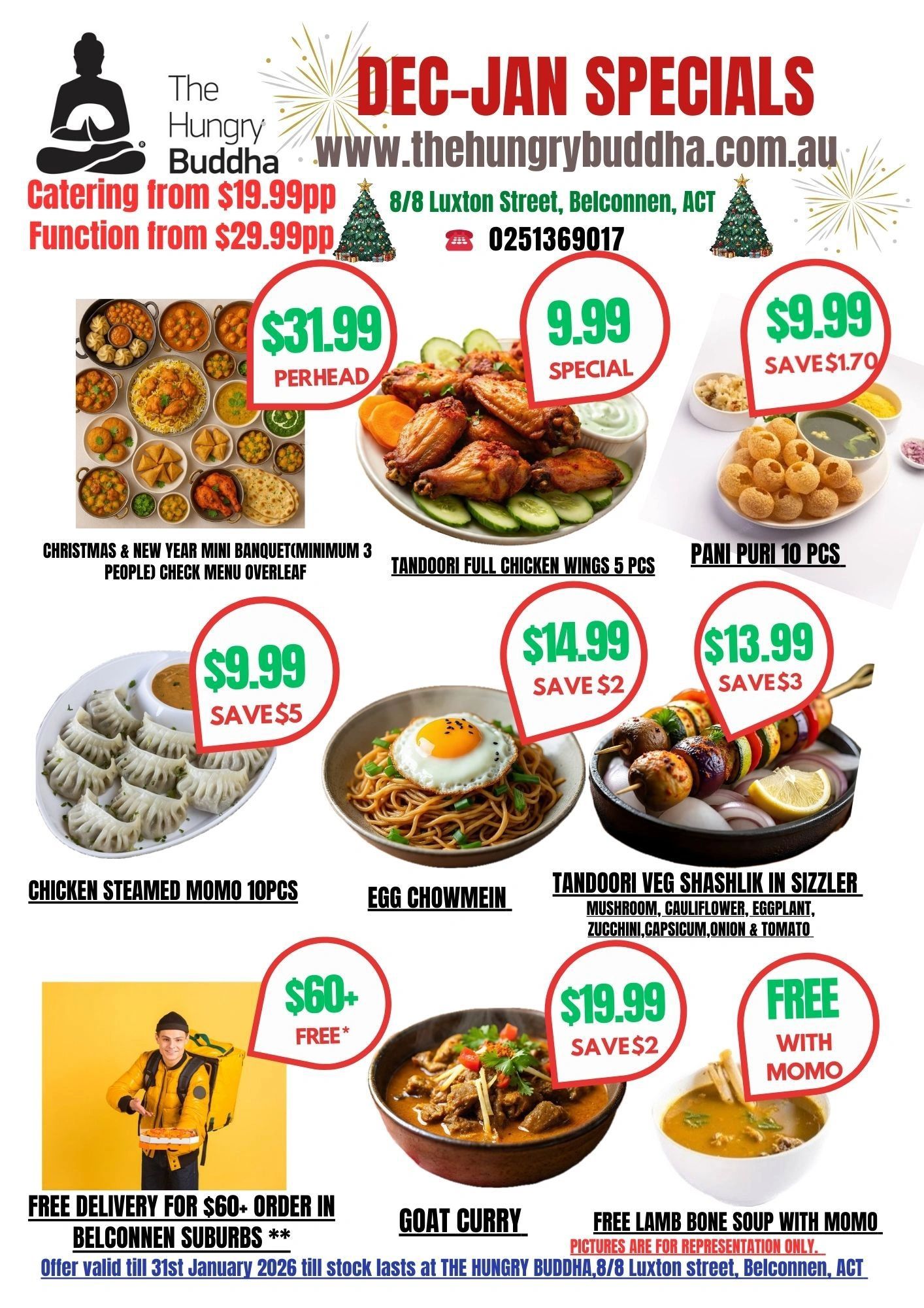 INFORMATION The Hungry Buddha is open 7 days. Monday-Sunday: - 5 pm to 9.45pm. We have our own dedicated order online website, and we encourage customers to use our platform at www.thehungrybuddha.com.au to order takeaway. Restaurants pay as much as 35% commission to large order online companies. We cater for most diets. If you have specific allergy, please contact our wait staff before ordering a meal We do functions, events, gatherings, party & catering. Remember us for your next event. Thank you for your patronage. Online Reviews help small business. Help us by visiting the Google Page to review our food & service.
